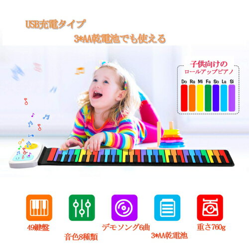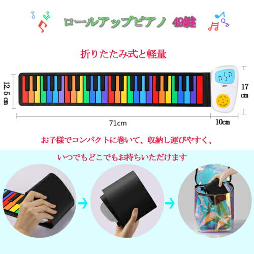 子供ピアノ 49鍵盤 カラフル ロールピアノ 折り畳みピアノ 初心者 練習 持ち運び便利 録音機能搭載 スピーカー内蔵 イヤホン接続可能 知育玩具 ホームパーティー キャンプ 忘年会 新年会 集会 正月 誕生日 子供 クリスマスプレゼント